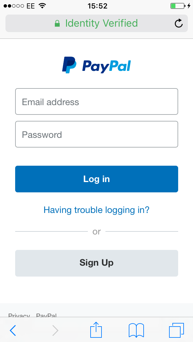 Risultato: una vittima che visita il sito con il proprio iPhone e Safari (per esempio perché ha cliccato su un link in una mail che finge di essere un allarme di Google o Paypal) si trova davanti quello che si aspetta, ossia la schermata di immissione password di Google o Paypal, e vede in alto, al posto del nome del sito (che potrebbe rivelare l’inganno), le parole rassicuranti Identity Verified. Parole che sembrano autenticare il sito, ma sono semplicemente il nome della ditta.