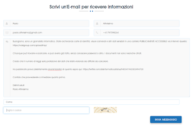 Grazie anche alle dritte arrivatemi nel frattempo dai lettori, ho segnalato la questione al Garante per la Protezione dei Dati Personali, gratuitamente e con una semplice mail. Il Garante ha avviato un provvedimento di blocco e i documenti ora non sono più online nel sito, ma restano a spasso su Internet, nelle mani di chiunque voglia abusarne.