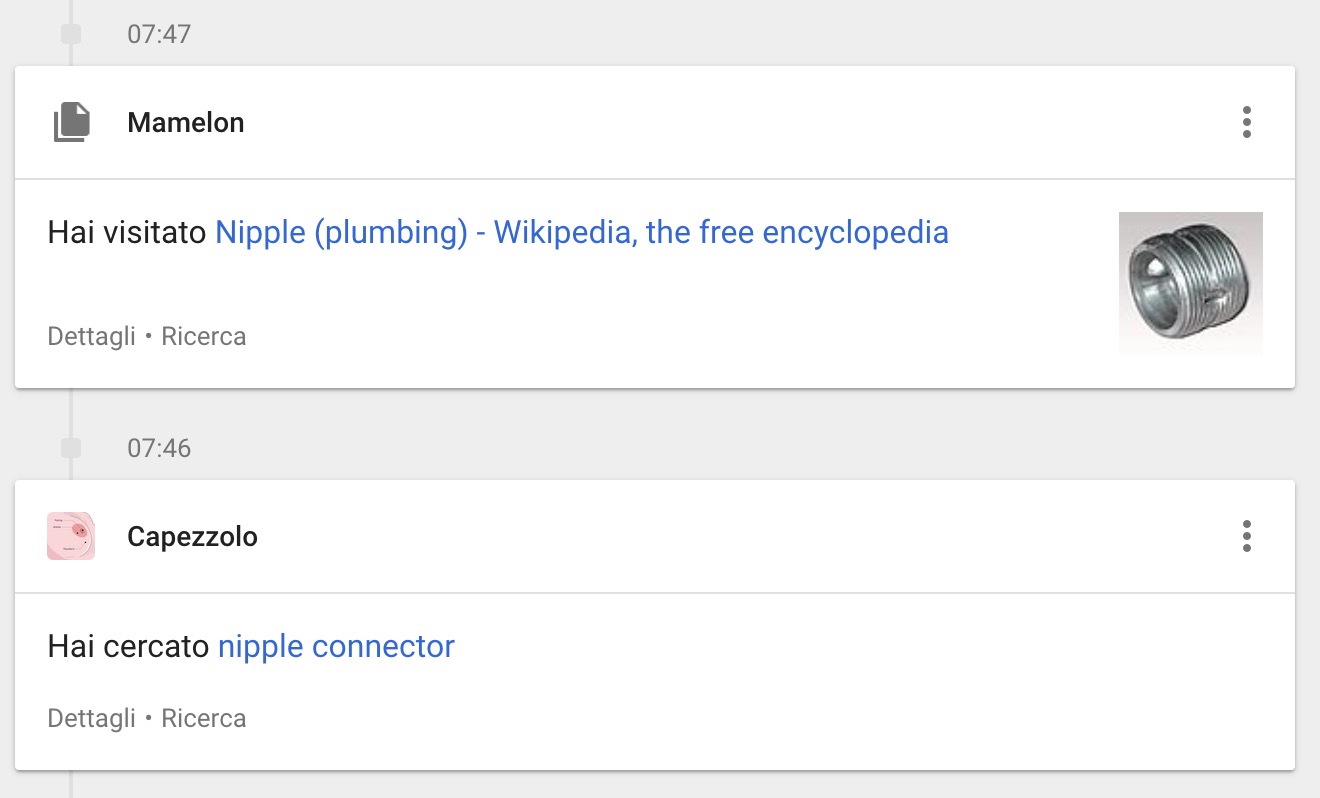La cosa può risultare imbarazzante se qualcuno vi ruba l’account o se lasciate incustodito il vostro computer o altro dispositivo digitale che usa il vostro account Google, perché a Google si chiede qualunque cosa, senza pudori, e anche perché una ricerca innocente può causare equivoci, come mostra lo screenshot (è un caso capitato a me proprio ieri).