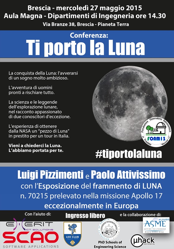 A Brescia sarà presso l'Aula Magna dei Dipartimenti di Ingegneria, in via Branze, dove alle 14:30 Luigi Pizzimenti ed io racconteremo la sua storia, la storia di chi l'ha raccolta sulla Luna e la storia di quanta faccia tosta ci vuole per andare alla NASA a chiedere di farsi prestare un pezzo di Luna per fargli fare l'ultimo tratto del viaggio dalla Luna a voi. L'evento è a ingresso libero. Trovate un articolo informativo sul Giornale di Brescia.