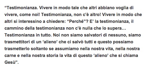 Il sito ufologico cita infatti queste parole del Papa, che nel video si esprime in spagnolo: “Noi non siamo salvatori di nessuno, siamo trasmettitori di un “alieno” che ci salvò tutti e questo possiamo trasmetterlo soltanto se assumiamo nella nostra vita, nella nostra carne e nella nostra storia la vita di questo “alieno” che si chiama Gesù”.