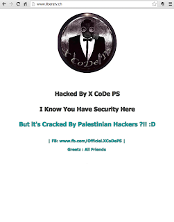 Dicembre 18, 2014 19:12Mi è arrivata poco fa da un collega, Marco Cagnotti, la segnalazione che il sito di Liberatv.ch è stato violato e ora la sua pagina iniziale ha l'aspetto mostrato qui accanto.Un rapido esame al codice HTML della pagina non mostra nulla di pericoloso per chi visita il sito: soltanto alcuni indirizzi di mail (palestine.ghost@gmail.com, kil.er@hotmail.com), un riferimento a una pagina Facebook (www.fb.com/Officiel.XCoDePS) e un link a un video musicale su Youtube.