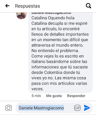 In traduzione (correggetemi se ho sbagliato qualcosa): “Salve Catalina, [scusami??] se mi sono ispirato al tuo articolo, l'ho trovato pieno di dettagli importanti in un momento così difficile che coinvolge tutto il mondo. Non capisco il problema. Come vedi l'ho scritto in italiano basandomi sulle informazioni che tu hai riportato dalla Colombia, dove tu vivi e io no. Succede la stessa cosa con i miei articoli, più volte.”