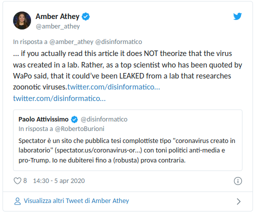 ... if you actually read this article it does NOT theorize that the virus was created in a lab. Rather, as a top scientist who has been quoted by WaPo said, that it could’ve been LEAKED from a lab that researches zoonotic viruses.https://t.co/ts3Kp02zrL https://t.co/bl1exmHgNT— Amber Athey (@amber_athey) April 5, 2020