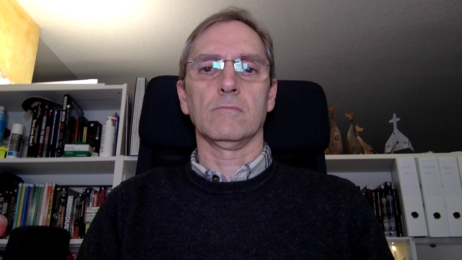 | Sfondo scuro, maglione scuro, inquadratura dal basso, luci stavolta laterali ma comunque dirette segnano troppo il volto e si riflettono (meno) negli occhiali. |