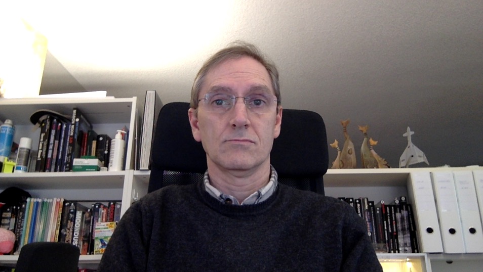 | Sfondo scuro, maglione scuro, inquadratura dal basso, luci stavolta laterali ma comunque dirette segnano troppo il volto e si riflettono (meno) negli occhiali. |