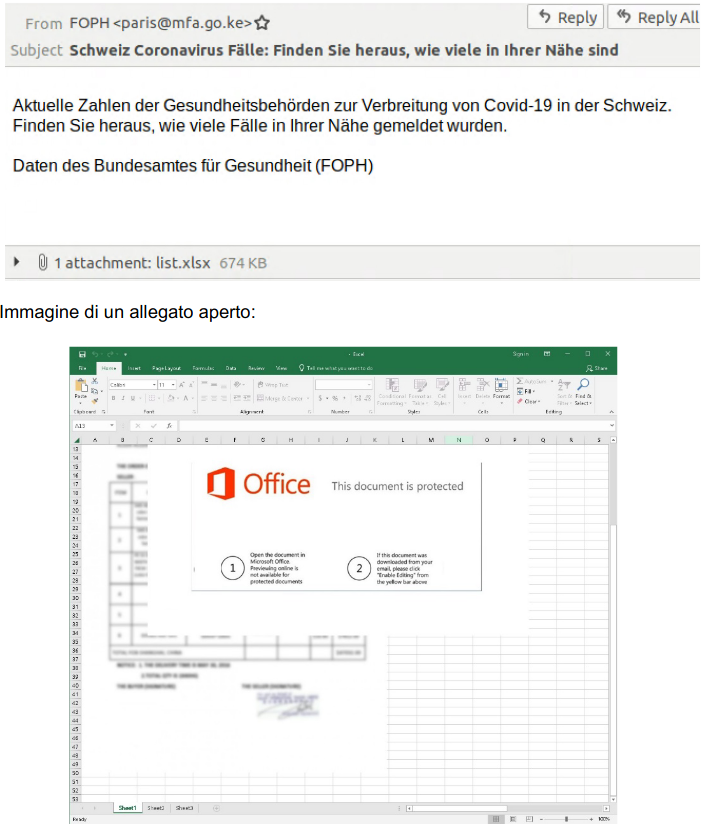 Marzo 20, 2020 10:11Criminali e sciacalli non dormono mai. MELANI, la Centrale d’annuncio e d’analisi per la sicurezza dell’informazione della Confederazione, mette in guardia la popolazione contro le false mail che sembrano provenire dall’Ufficio Federale della Sanità Pubblica e fornire informazioni sanitarie ma sono in realtà trappole create da criminali informatici. MELANI raccomanda di cancellare immediatamente queste mail, di non aprire i loro allegati e non cliccare sui loro link.Le mail-trappola veicolano infatti un malware, soprannominato AgentTesla, che può installarsi sul dispositivo digitale della vittima e prenderne il controllo a distanza, leggendo anche le password.