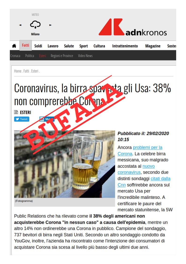 Marzo 4, 2020 7:38La notizia secondo la quale il 38% degli americani non comprerà più la birra Corona perché la associa al coronavirus è una bufala. Specificamente, è una fandonia costruita da un’agenzia di sondaggi in cerca di visibilità.Lo spiega molto dettagliatamente Bufale un tanto al chilo: tutto parte da un sondaggio della 5W Public Relations (comunicato stampa qui), condotto telefonicamente su un campione di 737 bevitori di birra statunitensi, che annuncia che “il 38% dei bevitori di birra americani adesso non comprerebbe Corona in nessuna circostanza” (“38% of beer-drinking Americans would not buy Corona under any circumstances now”).