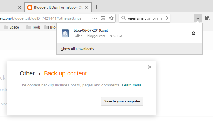 Il metodo di backup standard di Blogger, che ho usato fin qui (Impostazioni - Altro - Backup), non funziona più: crasha puntualmente ogni volta, dopo aver superato il centinaio di megabyte. Ed è così da parecchie settimane. Ho già chiesto lumi all’assistenza di Blogger. Pare che sia un problema diffuso.
