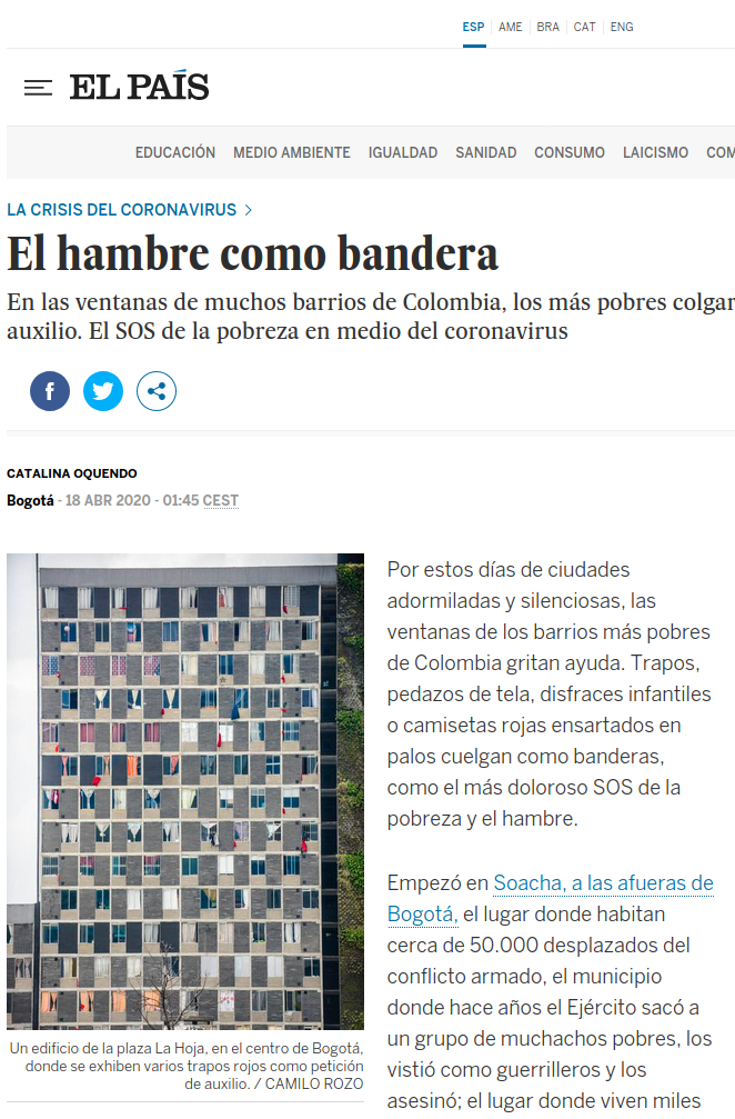 | Ma questo simbolo di una crisi che oltre a essere sanitaria colpisce la parte più debole dei debole dei colombiani, l’esercito degli ambulanti, degli invisibili, gli ultimi degli ultimi, il 45 per cento della popolazione, si sia trasformato in un simbolo di lotta e di protesta. Nelle comunas alte di Medellín, dove dai balconi si battono i mestoli contro pentole e padelle, nelle calde pianure della Magdalena, nord del Paese, nelle lande paludose di Ciudad Bolívar, periferia estrema di Bogotá, nel quartiere di Bosa Porvenir, sempre ai margini della capitale, le stoffe rosse sono il nuovo Sos lanciato da chi cerca di salvarsi dalla pandemia ma rischia di morire di fame. | La giornalista di El País, Catalina Oquendo, ha raccolto questo grido di aiuto e con notevole coraggio visto i rischi del coronavirus, riuscendo a ottenere un permesso per uscire di casa assieme a un fotografo, si è recata sul posto e ha confermato quello che le voci raccontavano in una Bogotà blindata. Nella sua corrispondenza racconta come questo aspetto nascosto di una crisi che oltre a essere sanitaria colpisce la parte più debole dei colombiani, l’esercito degli ambulanti, degli invisibili, gli ultimi degli ultimi, il 45 per cento della popolazione, si sia trasformato in un simbolo di lotta e di protesta. “Nelle comunas alte di Medellín, dove dai balconi si battono i mestoli contro pentole e padelle, nelle calde pianure della Magdalena, nord del Paese, nelle lande paludose di Ciudad Bolívar, periferia estrema di Bogotá, nel quartiere di Bosa Porvenir, sempre ai margini della capitale”, osserva la collega, “le stoffe rosse sono il nuovo Sos lanciato da chi cerca di salvarsi dalla pandemia ma rischia di morire di fame”. |