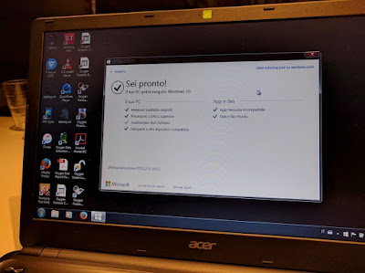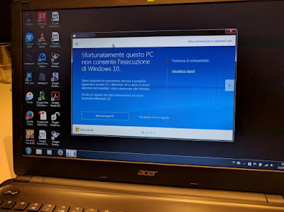 In effetti moltissimi utenti mi hanno segnalato installazioni effettuate senza alcun problema, per cui ho provato anch’io ad aggiornare un laptop (Acer Aspire E1-510) sul quale avevo Windows 7 per fare informatica forense. Ho accettato l’invito e Windows mi ha detto “Sfortunatamente questo PC non consente l’esecuzione di Windows 10”, nonostante Acer lo dichiari compatibile.