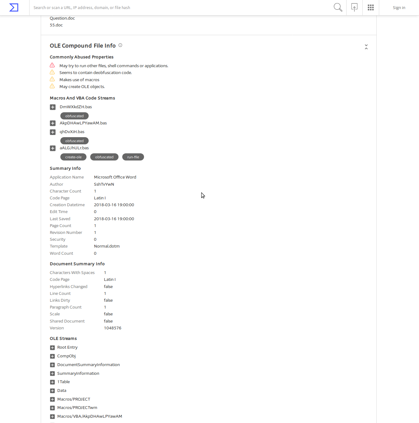 Virustotal mi fornisce anche informazioni sulla natura di questo malware, basato sulle macro di Word: