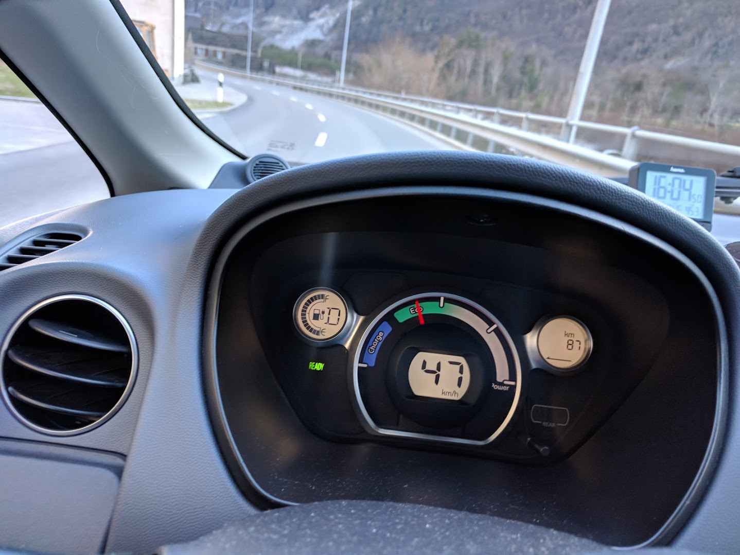 La strada da Cadenazzo a Cevio è ricca di curve e ha quasi ovunque un limite di 60 km/h, che è ottimale per auto da città come la iOn, che non hanno un’aerodinamica esasperata e consumano parecchio a velocità elevate. È anche una strada molto pittoresca, in mezzo ai boschi, e sto già pregustando l’idea di girare con l’auto da queste parti a finestrini aperti, in estate, accompagnato solo dai suoni dell’ambiente e dal fruscio delle ruote, senza il baccano del motore a benzina.