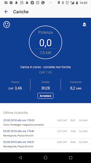 Dopo 18 minuti (trascorsi produttivamente lavorando) abbiamo già l’80% di carica. La colonnina si spegne automaticamente, ma prima che io riesca a riporre il computer c’è una sorpresa: è già partita la seconda carica, che è lenta e porterebbe la batteria al 100% in 50 minuti. Non sapevo di questa funzione. Comunque non ci serve e non abbiamo 50 minuti di tempo, per cui interrompo la ricarica e il viaggio prosegue. Abbiamo speso 1,52 franchi.