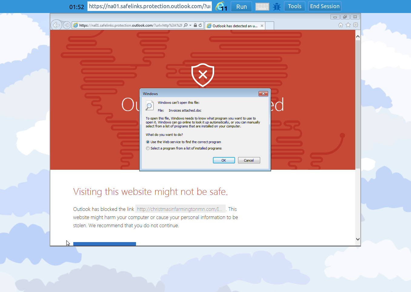 Ottengo di nuovo un avviso di Outlook, e quando clicco sul link mi viene proposto di scaricare un documento Word. Molti utenti non sanno che i documenti Word possono essere infettanti e quindi si fidano: è una trappola molto efficace.