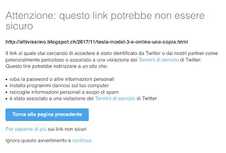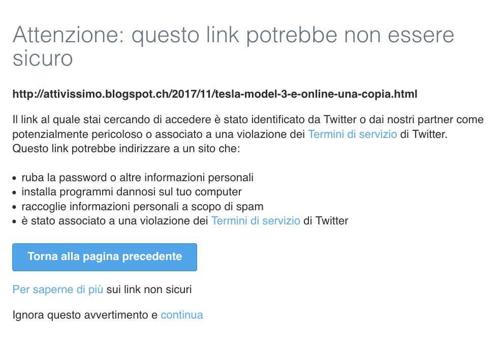 Da ieri il mio articolo sul manuale della Tesla Model 3 viene bloccato e segnalato da Twitter con l’avviso (copia su Archive.is) che “Il link al quale stai cercando di accedere è stato identificato da Twitter o dai nostri partner come potenzialmente pericoloso o associato a una violazione dei Termini di servizio di Twitter”. Cliccando su Continua si viene comunque portati all’articolo.