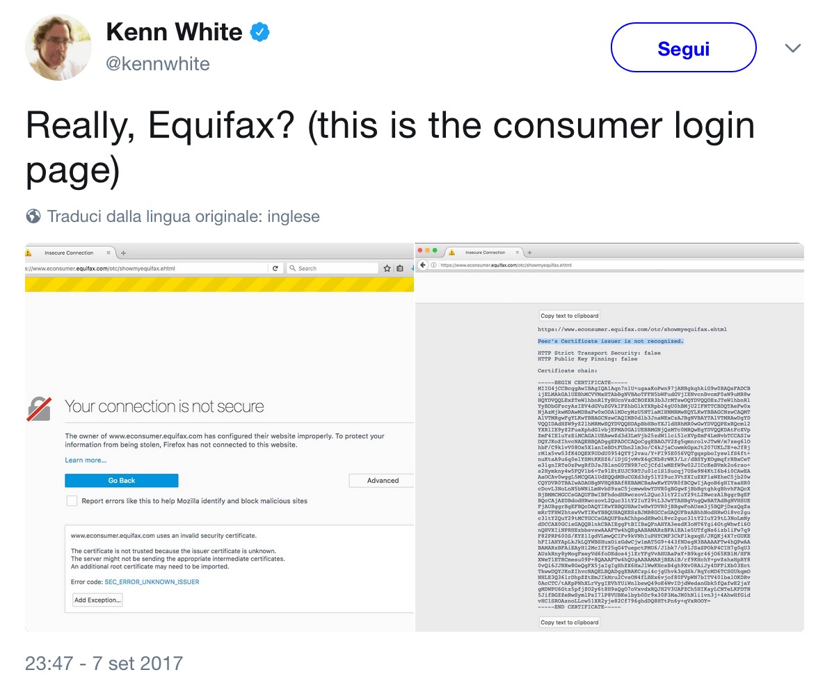 La cosa particolarmente bruciante di questo furto recentissimo è la fonte: è Equifax, ossia una delle più grandi società statunitensi dedicate alla gestione delle violazioni dei dati personali. Quando un’azienda subisce un furto di dati, protegge i propri clienti rivolgendosi a Equifax. Ma stavolta chi proteggerà i 143 milioni di utenti, che dipendono proprio da Equifax per cose come prestiti e crediti?