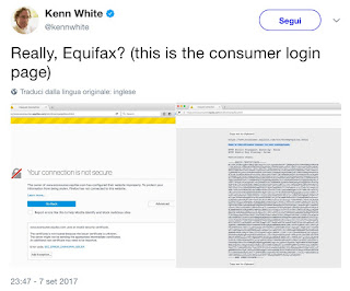 Cosa peggiore, Equifax ha reagito al furto in maniera disastrosa: ci ha messo cinque settimane a rivelarlo, e il sito che ha creato per consentire agli utenti di verificare se sono stati rubati i loro dati personali, www.equifaxsecurity2017.com, non ha le sicurezze di base e non è neanche registrato a nome di Equifax, tanto che le applicazioni di sicurezza e i servizi di protezione come OpenDNS lo hanno segnalato come sito potenzialmente fraudolento.