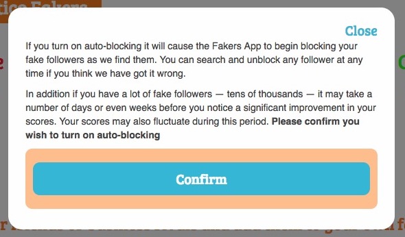 La versione Premium (£11.97/mese) offre la stessa schermata con l’aggiunta di un’opzione Auto Block Fakes (spenta per default). Se la si attiva, compare un avviso che chiede conferma della richiesta di bloccare automaticamente quelli che Statuspeople considera fake e ricorda che se l’account ha tanti fake (decine di migliaia) possono volerci giorni o settimane prima che la valutazione migliori: