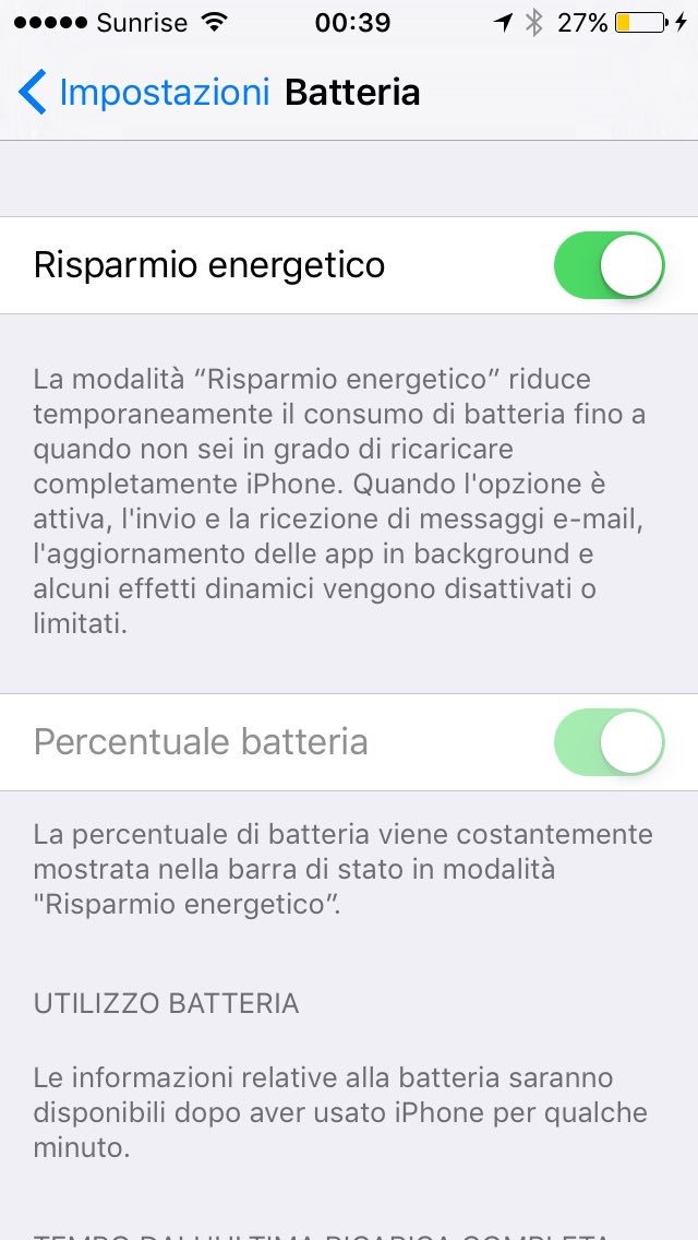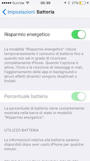 мая 27, 2016 6:22Afflitti da problemi di durata della batteria nel vostro smartphone Apple? Howtogeek segnala che in iOS 9 è stata introdotta una modalità di risparmio energetico (solo per gli iPhone, non per gli iPad): quando la batteria scende al 20% di carica residua, compare un avviso che invita ad attivare questa modalità. Ma potete anche decidere di attivarla manualmente, per esempio se prevedete di essere lontani da una presa di corrente o da un altro dispositivo di ricarica per molte ore di seguito.Per attivarla manualmente andate nelle Impostazioni, scegliete Batteria e attivate la voce Risparmio energetico. Questo riduce la luminosità dello schermo, disabilita l’invio e la ricezione delle mail, l’aggiornamento in background delle app e alcuni degli effetti grafici dell’iPhone (per esempio gli sfondi animati), e accorcia il tempo di blocco e spegnimento automatico dello schermo. L’indicatore della batteria diventa giallo e compare l’indicazione della percentuale di carica (se non l’avevate già attivata manualmente). Dietro le quinte, il processore principale e quello grafico vengono rallentati, facendo diventare l’iPhone un po’ lento nel rispondere ai comandi.