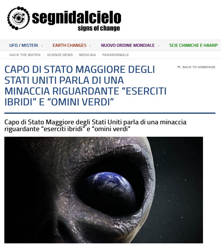 мая 27, 2016 6:50Ancora una volta gli ufologi (non tutti, ma tanti di loro) dimostrano il problema principale dell’ufologia: la totale mancanza di senso della realtà.La notizia del momento è che “il generale Mark A. Milley, capo di stato maggiore dell’Esercito degli Stati Uniti (US Army), ha dichiarato al pubblico..., che i futuri soldati potranno confrontarsi con dei temibili avversari ‘ibridi’ e ‘piccoli omini verdi’”.