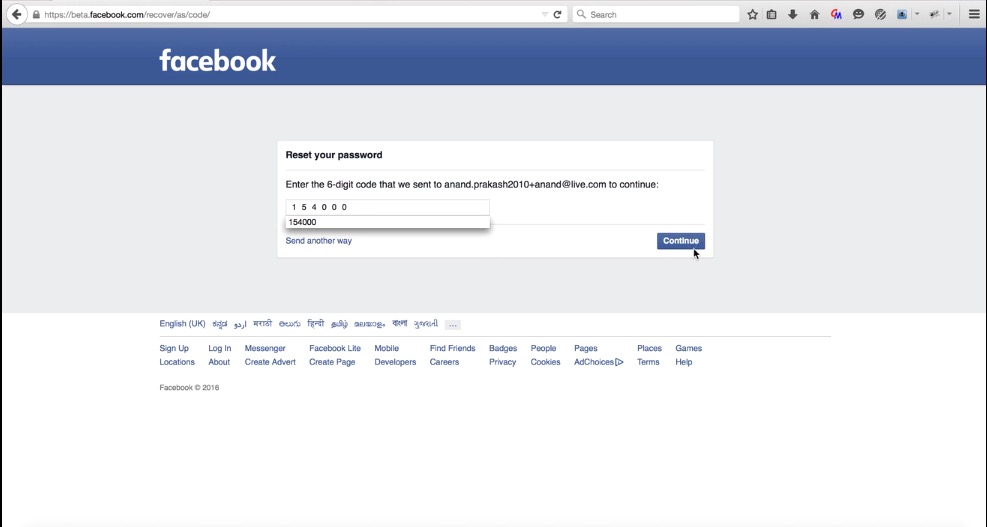 Un aspirante intruso potrebbe in teoria attivare “Ho dimenticato la password” sull’account della vittima e poi tentare tutte le combinazioni possibili delle sei cifre del codice fino a trovarlo, ma Facebook limita il numero di tentativi. Anand Prakash si è accorto, però, che questo limite non c'era nei siti di test (come beta.facebook.com) e quindi era possibile tentare infinite volte fino a trovare il codice per prendere il controllo dell’account e ottenere accesso ai messaggi, ai dati delle carte di credito memorizzate, alle foto personali, eccetera.