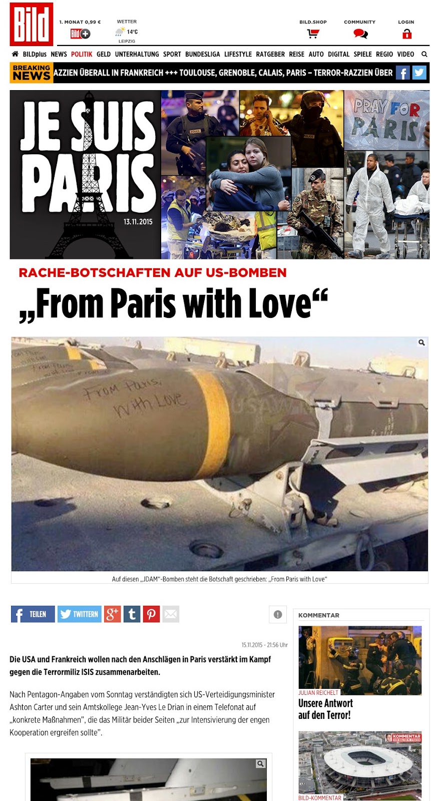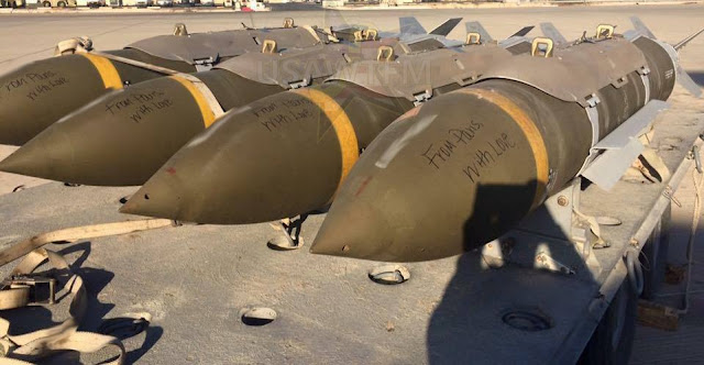 Sta circolando nei social network, ed è stata pubblicata dalla testata tedesca Bild, una foto che mostra quelle che sembrano essere bombe sulle quali c’è la dicitura inglese “From Paris, with Love” (“Da Parigi con amore”). La foto viene solitamente presentata, come fa anche La Stampa con formula dubitativa, dicendo che si tratta delle bombe che l’aviazione francese ha sganciato il 15 novembre sulla città siriana di Raqqa, distruggendo due campi di addestramento dell'Isis, mandante delle stragi di Parigi di venerdì 13 novembre.