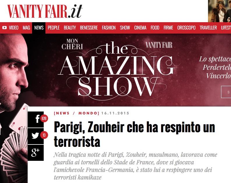 Ci hanno voluto credere in tanti, perché è una storia consolatrice, ma è una balla, diffusa ottusamente dai giornalisti che non controllano le fonti e dagli utenti dei social network che si fidano ciecamente di quello che leggono in giro: non è vero che un addetto alla sicurezza musulmano di nome Zouheir (o Zouheri) ha fermato uno degli attentatori all’ingresso dello stadio parigino dove c’erano 80.000 persone per la partita Francia-Germania.