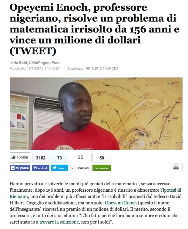 Un professore nigeriano, Opeyemi Enoch, ha risolto un problema di matematica, la cosiddetta ipotesi di Riemann, che giaceva irrisolto da oltre un secolo e mezzo e si è quindi aggiudicato un premio da un milione di dollari? Secondo Ilaria Betti di Huffington Post sì. E Repubblica copia e incolla senza verificare. Ci casca anche Marika Luongo su Leonardo.it. Anche ADNKronos dice di sì nel titolo della notizia, ma poi corregge il tiro.