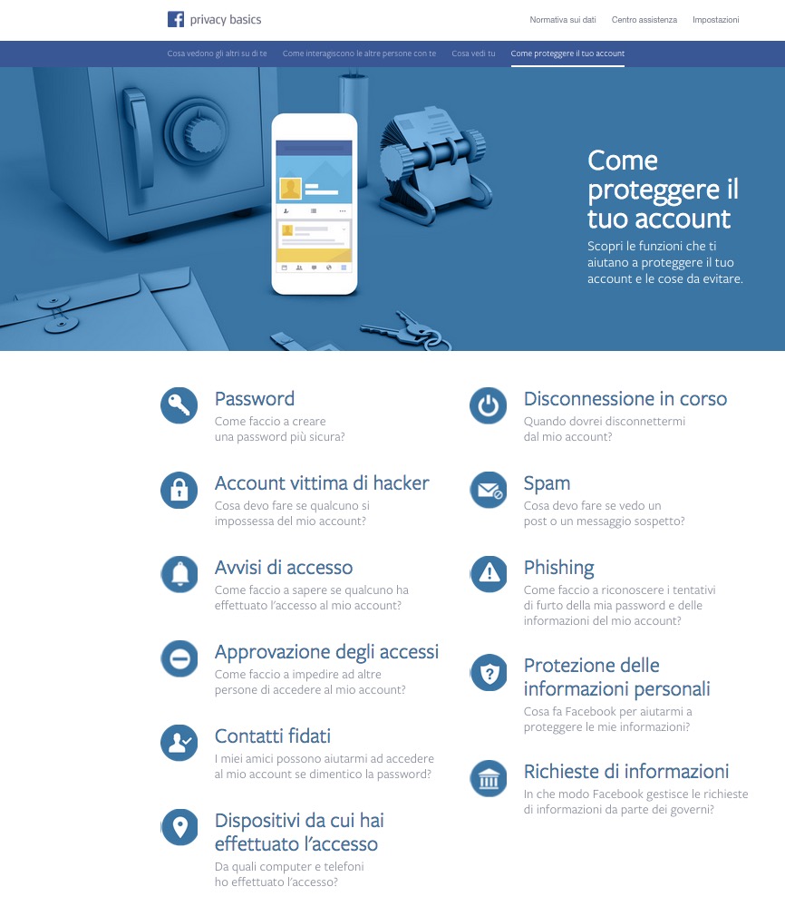 апреля 9, 2015 21:20Facebook ha messo online una guida molto pratica, disponibile anche in italiano, che spiega come impostare correttamente le password, come risolvere un furto di account e riconoscere un tentato furto (phishing) e descrive in linguaggio chiaro molte altre funzioni di sicurezza e di privacy.È molto importante, in particolare, la sezione dedicata alla verifica in due passaggi, che permette di difendere il proprio account anche in caso di furto di password: nelle Impostazioni dell'account, scegliete Protezione e poi attivate la casella Approvazione degli accessi attiva. Immettete il numero del proprio telefonino e riceverete un codice di conferma da immettere. Facendo questo una sola volta, da quel momento in poi riceverete sul telefonino un avviso se qualcuno tenterà di entrare nell'account conoscendone la password ma usando un telefonino, computer o browser diverso dai vostri.