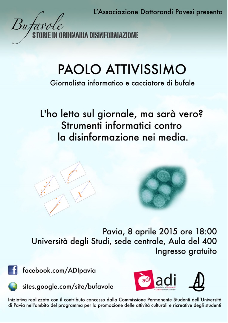Oggi pomeriggio alle 18 sarò a Pavia, all'Aula del '400, per una conferenza intitolata “L’ho letto sul giornale, ma sarà vero? Strumenti informatici contro la disinformazione nei media”. L'ingresso è libero e l'incontro è organizzato dall'Associazione Dottorandi Pavesi in collaborazione con l'Università degli Studi di Pavia.