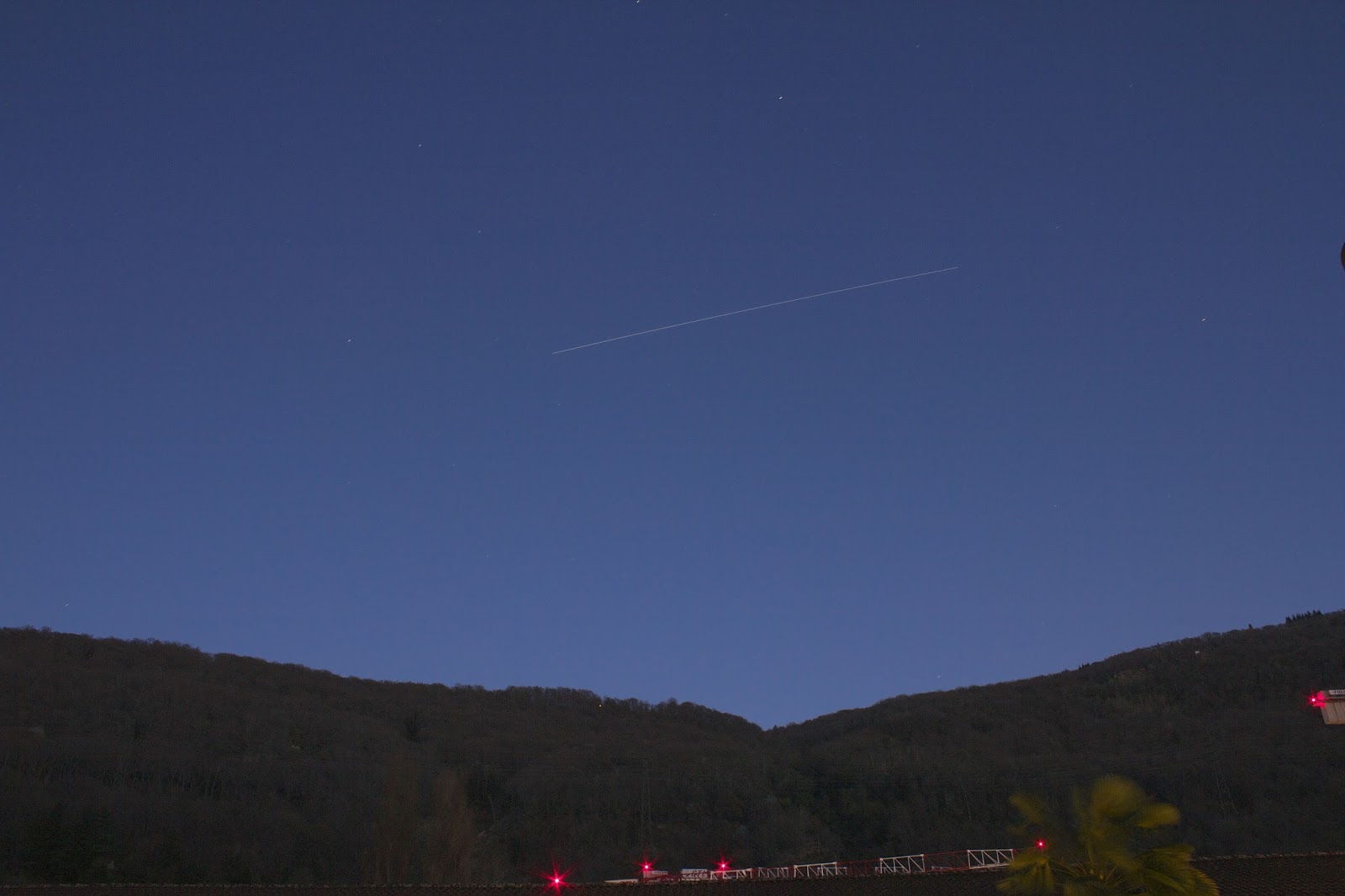 Ho portato con me la GoPro per documentare la ripresa e mostrare l'aspetto della Stazione dal vivo: è il puntino bianco che tramonta dietro le colline, al centro dell'inquadratura. Probabilmente per vederlo bene dovrete ingrandire il video portandolo a tutto schermo.
