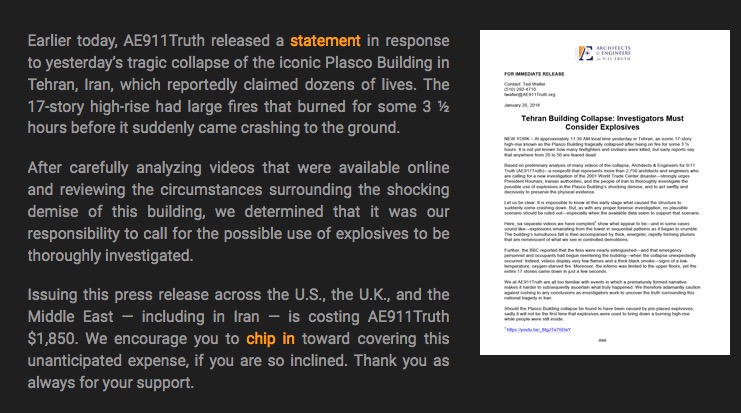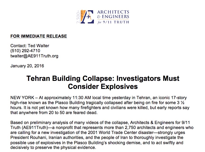 5. Per AE911, il crollo in Iran invece dimostra che anche l'edificio iraniano è stato minato di nascosto.