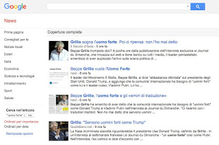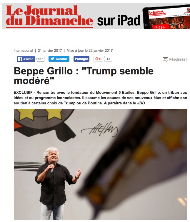 Oggi ANSA ha riportato una dichiarazione attribuita a Beppe Grillo: “‘La politica internazionale ha bisogno di uomini forti’ come Trump e Putin”, ha scritto ANSA, indicando come fonte di questa dichiarazione “un'intervista al settimanale francese Le Journal du Dimanche”.