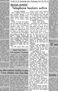 L’informatico Graham Cluley segnala infatti un articolo del 20 novembre 1963, pubblicato sul giornale del campus del Massachusetts Institute of Technology (MIT), che parla già di hacker nel senso di vandali informatici. Nel caso citato dall’articolo, gli hacker hanno alterato la rete telefonica dell’istituto per addebitare le chiamate interurbane facendole pagare a un impianto radar locale, hanno collegato il computer PDP-1 alla rete telefonica per trovare le linee che consentivano di fare chiamate esterne, e altro ancora.