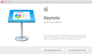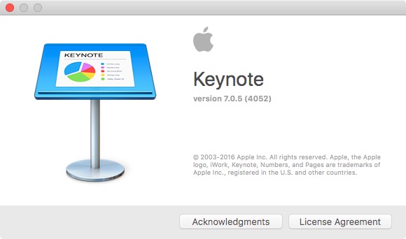 In attesa che l’attuale Keynote riprenda (forse) a funzionare correttamente, ho recuperato un vecchio Keynote 6.2.2 da uno dei miei backup e l’ho installato accanto alla versione corrente: funziona senza problemi. Per convertire le presentazioni create con Keynote 7 in modo che siano leggibili da Keynote 6 basta esportarle con Keynote 7 salvandole in formato Keynote '09.