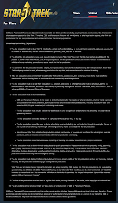 Oggi CBS e Paramount hanno pubblicato le loro linee guida per la produzione di fan film di Star Trek, accompagnate da una simpatica letterina. Non ho tempo di tradurle per intero, anche perché leggerle mi fa venire un travaso di bile. Ma segnalo giusto un paio di perle: