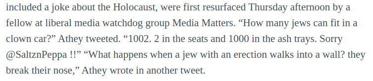 The anti-Semitic tweets I’m referring to are these (as acknowledged by Athey). Due to their content, I refuse to transcribe them and I will only include them as a screenshot:
