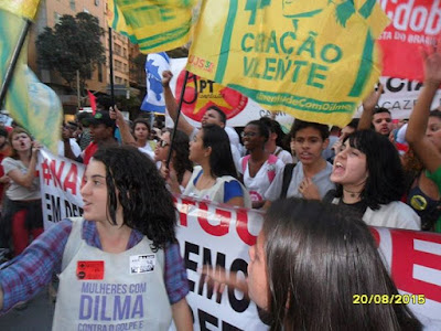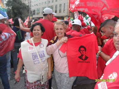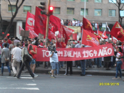 #Dia20EuVou - Estive no ato pela democracia e mais direitos do dia 20 de agosto no centro do Rio de Janeiro onde registrei algumas imagens com uma pequena máquina digital e sem iluminação adequada. Algumas eu postei no Facebook logo que cheguei (clique aqui para ver). Mas acredito que a emoção compense. O Brasil estava lá, a esquerda estava lá, o cidadão comum, políticos, jovens da UNE, UBES, UJS, UEE, Levante Popular, PT, PCdoB, etc., sindicalistas da CUT, CTB e outros, os movimentos sociais, Negros, LGBT, MST e outros, e a tônica era muita alegria, mais direitos, mais democracia e mais Lula e Dilma Rousseff. Clima bem diferente da passeata do dia 16 na Paulista, onde algumas senhoras exibiram cartazes cobrando a morte de todos (esquerda) em 1964 e o enforcamento de Dilma no Doi-Codi.