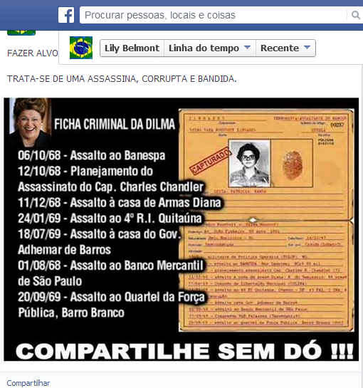 Um pequeno exemplo do que vem por aí quando a campanha eleitoral para a Presidência da República esquentar se encontra no Facebook, onde uma tal Lily Belmont, provavelmente um pseudônimo, conclama as pessoas a se armarem para "fuzilar os canalhas", referindo-se aos "petralhas" e aliados e, como se não bastasse, estampa uma "ficha criminal da Dilma", inteiramente falsa, chamando-a de "assassina, corrupta e bandida".