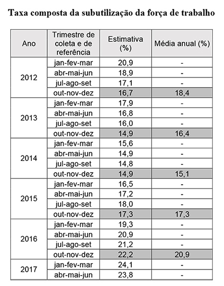 Essa taxa caiu de 24,1%, no primeiro trimestre de 2017 para 23,8% no segundo trimestre, mas os níveis do indicador para 2017 são os maiores da série histórica, medida desde 2012, o que indica que, para os trabalhadores, a crise no mercado de trabalho ainda está longe de passar. (Fundação Perseu Abramo)