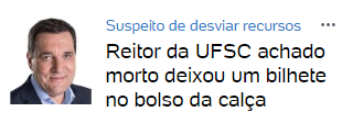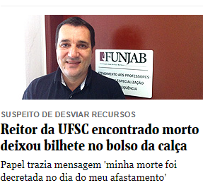 octubre 2, 2017 22:35Títulos das homepages da Folha de S. Paulo e do portal UOL da notícia do suicídio do reitor da Universidade Federal de Santa Catarina, Luiz Carlos Cancillier de Olivo, vítima da meganhagem que manda no Brasil, são praticamente iguais na canalhice.