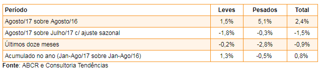 No acumulado do ano (Jan-Ago/17 sobre Jan-Ago/16), o fluxo total de veículos nas rodovias concedidas acumulou crescimento pífio de 0,8%. O fluxo de veículos leves aumentou 1,3%, enquanto o fluxo de pesados se retraiu 0,5%.