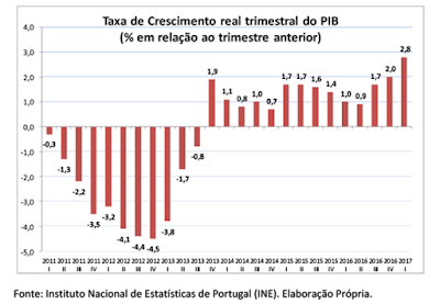 Ao contrário do que a cartilha da austeridade fiscal defende, são as medidas de estímulo econômico que tanto têm feito a economia portuguesa crescer, quanto têm melhorado as contas públicas do país e seu nível de emprego. O PIB português cresce há 14 trimestres consecutivos, atingindo 2,8% no primeiro trimestre de 2017, o desemprego se reduziu a 10,1% nesse mesmo trimestre e o déficit público caiu em mais de 5 pontos percentuais do PIB desde a supressão das medidas de austeridade e, em 3 anos, chegou a 2,0% do PIB – o nível mais baixo desde a transição de Portugal para a democracia, em 1974. (Brasil Debate/Fundação Perseu Abramo)