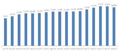 julio 5, 2017 17:40A taxa de desocupação foi estimada em 13,3% em maio de 2017, permanecendo relativamente estável em relação ao que foi apresentado em 2017 até o momento. Na comparação com o mesmo mês do ano anterior, quando a taxa foi estimada em 11,2%, o quadro foi de elevação (2,1 pontos percentuais). Essa foi a maior taxa de desocupação para um período terminado em maio desde o início da série da pesquisa, em 2012. Infelizmente, ainda levará algum tempo para que o mercado de trabalho se recupere da crise, na realidade, será uma das últimas variáveis macroeconômicas a mostrar resposta à recuperação da atividade econômica.