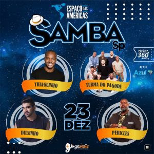 O Espaço das Américas, em São Paulo, vai se transformar em uma enorme roda de samba no domingo, dia 23 de dezembro. É nesta data que a casa recebe o “Samba SP”, festa que reúne shows dos principais nomes do gênero: Thiaguinho, Péricles, Turma do Pagode e Dilsinho.