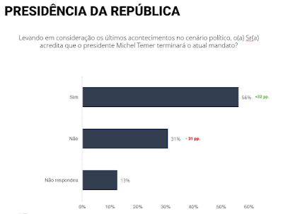 O presidente Michel Temer conseguiu reverter de maneira significativa a expectativa das principais lideranças do Congresso quanto ao desfecho de seu governo. No fim de maio, dias após a divulgação das delações do grupo J&F, apenas 24% da cúpula do Legislativo apostava que Temer concluiria o mandato. Dois meses depois, esse índice saltou para 56%. Já o percentual dos que acreditavam que o presidente será afastado do Palácio do Planalto despencou de 62% para 31%.