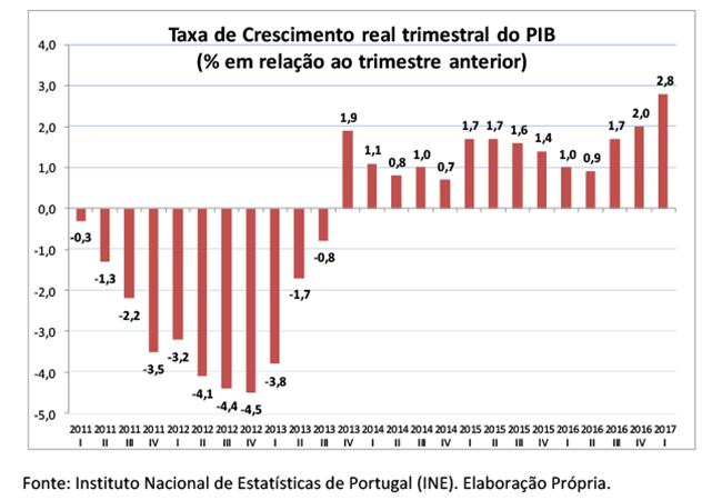 Ao contrário do que a cartilha da austeridade fiscal defende, são as medidas de estímulo econômico que tanto têm feito a economia portuguesa crescer, quanto têm melhorado as contas públicas do país e seu nível de emprego. O PIB português cresce há 14 trimestres consecutivos, atingindo 2,8% no primeiro trimestre de 2017, o desemprego se reduziu a 10,1% nesse mesmo trimestre e o déficit público caiu em mais de 5 pontos percentuais do PIB desde a supressão das medidas de austeridade e, em 3 anos, chegou a 2,0% do PIB – o nível mais baixo desde a transição de Portugal para a democracia, em 1974. (Brasil Debate/Fundação Perseu Abramo)
