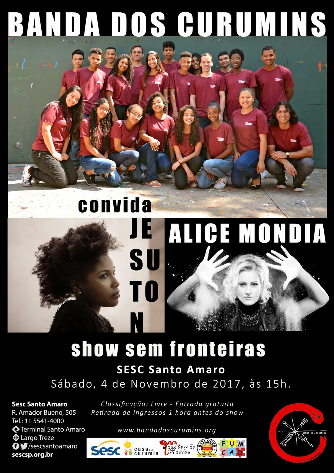октября 30, 2017 22:44Com o show musical “Sem Fronteiras” a Banda dos Curumins traz ao palco a cantora inglesa Jesuton e a suíça Alice Mondia. Músicas autorais da banda, clássicos brasileiros, canções da carreira de Alice Mondia e do recém-lançado álbum “Home”, de Jesuton, ganharam arranjos originais e exclusivos para o show, dia 4 de novembro, sábado, às 15 horas, no SESC Santo Amaro (Rua Amador Bueno, 505, Santo Amaro, São Paulo).