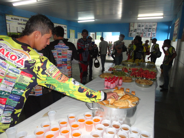 Antes de percorrer os 60 KM de percusso, os trilheiros fizeram aquele cafe da manhã bastante reforçado. A concentração aconteceu na Escola Municipal Abílio Alves de Miranda.